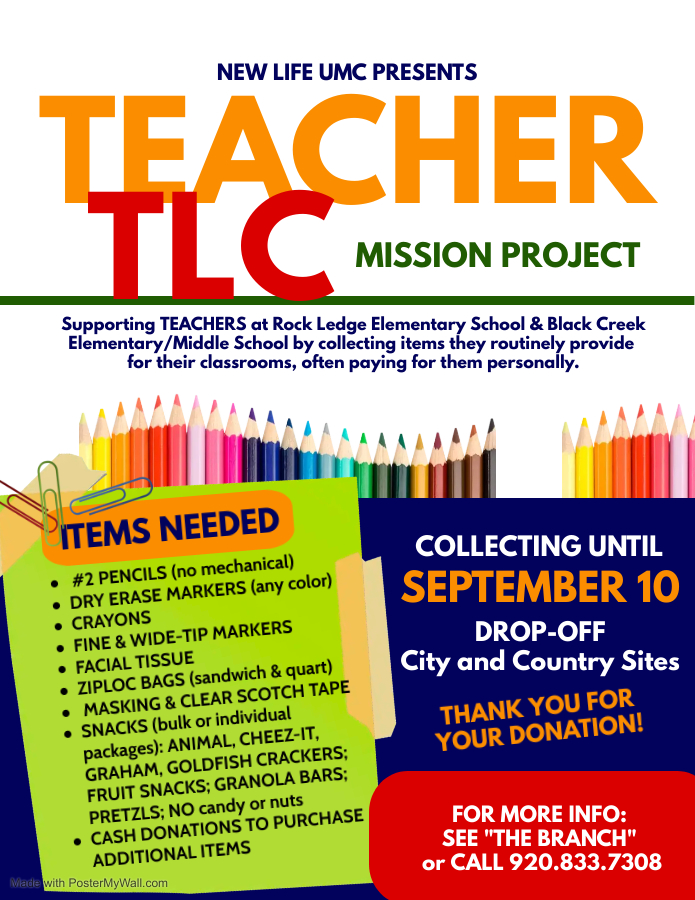 Teacher TLC – We are collecting specific school supplies to provide to teachers at Black Creek Elementary/Middle School and Rock Ledge Elementary.